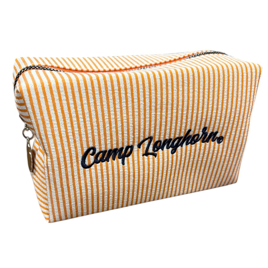 This striped, embroidered cosmetic bag has a silver zipper and easy to wipe clean interior. Perfect for trunks, bunks, purses & backpacks! Measures 7" X 4.5" X 3".