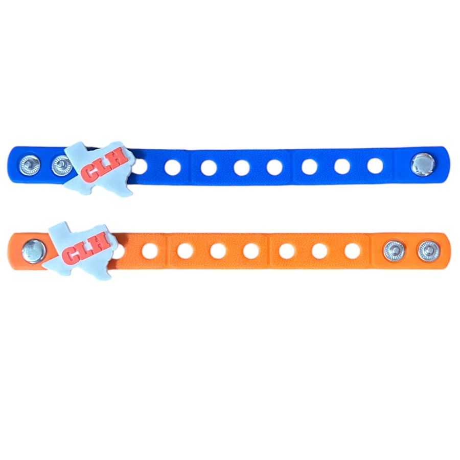 Now your camper can show off their camp jibbitz without wearing Crocs! This croc charm bracelet has 2 snaps for adjustable sizing and 9 holes for jibbitz. Comes with the new Texas CLH jibbitz! Available in orange or blue band.