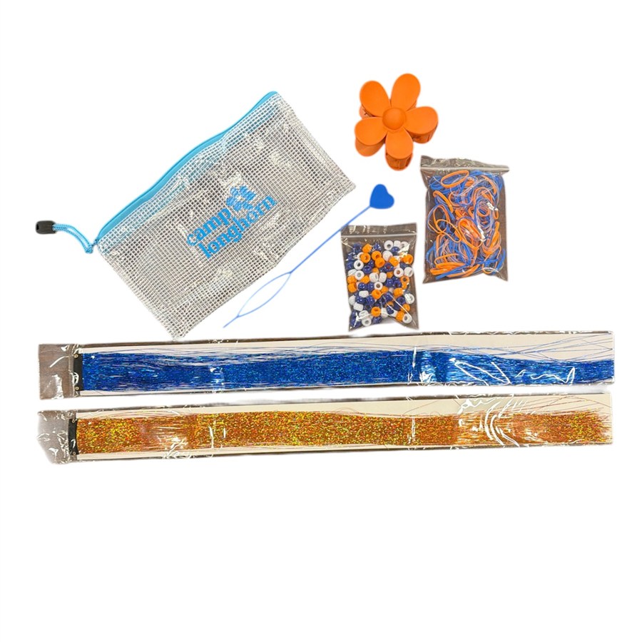 This kit includes what your camper needs to jazz up their 'do for dance night! Custom zippered bag includes orange claw clip, orange and blue tinsel, orange, royal, & white beads, quick hair beading tool, and clear, orange, and blue elastic hair bands.
