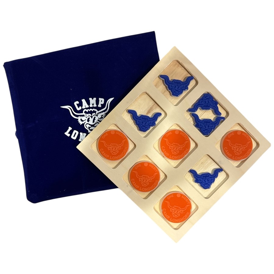 This one-of-a-kind wooden tic tac toe game features longhorn heads & merits. Who will win ... blue Charlie or orange merit? Comes with handy felt storage bag.