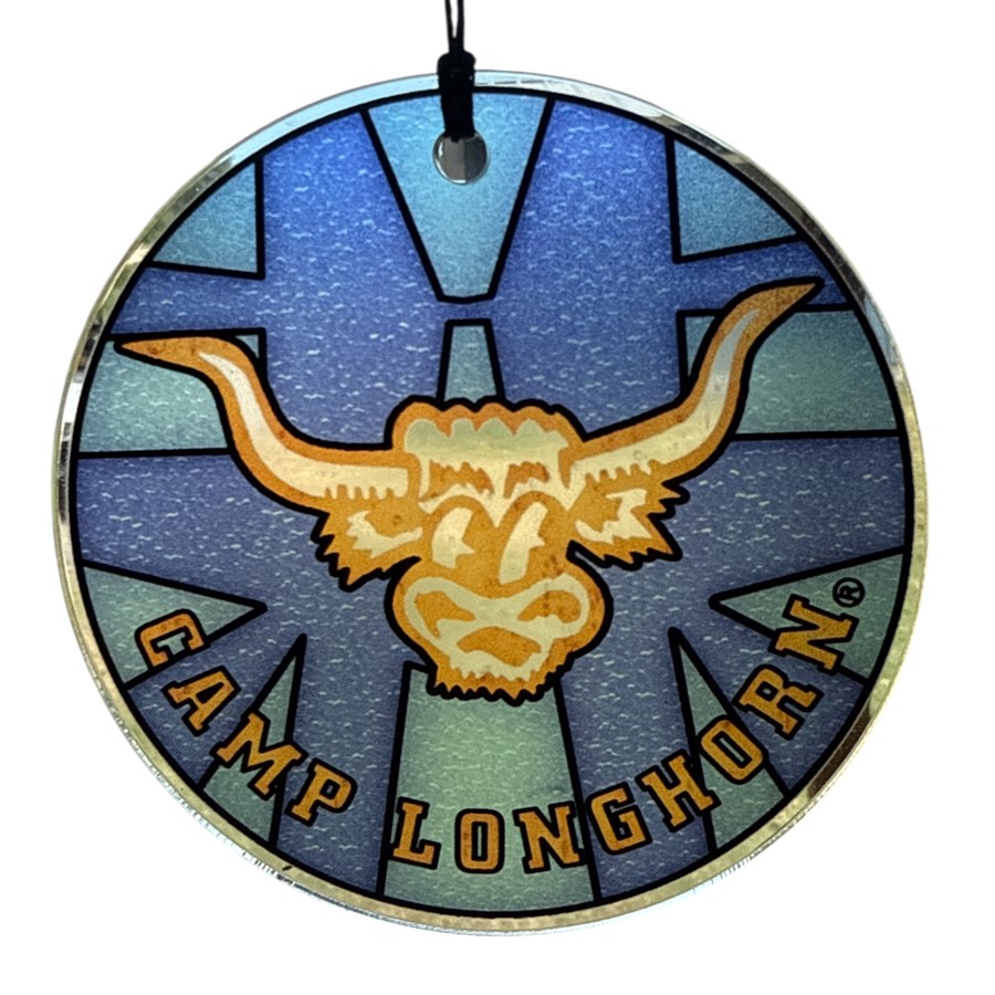 Round acrylic-stained glass suncatcher/ornament. Includes black cord for hanging. Size: 3-3/4” diameter.