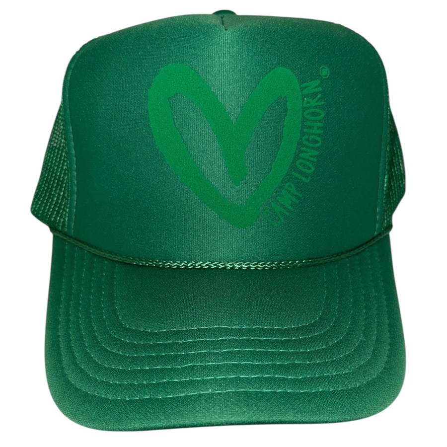 Celebrate camp spirit and meaningful living with this limited-edition collab from House of Shan and Camp Longhorn. Featuring the signature heart logo and bold kelly green design, this trucker hat proudly shares the "Live What You Love" message - perfect for campers who wear their heart on their head. Quality Craftsmanship: Snap Closure. 100% Polyester Front. 100% Nylon Mesh Back. 5-panel cap.