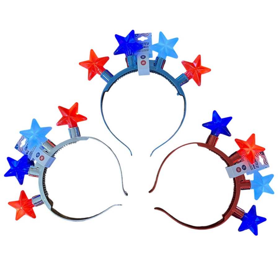 Fun headband has red, white & blue stars that light up! 3 light modes: quick flash, slow flash & steady light. Headband comes in red, silver or blue -our choice.